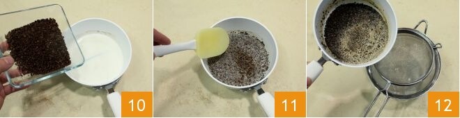 et ajoutez les grains de café 10. Mélangez avec une spatule, laissez refroidir 11, puis filtrez le lait et le café avec une passoire à mailles fines 12.