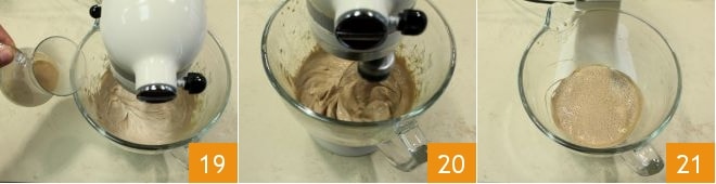 et le lait chaud en filet 19, en actionnant le robot pâtissier 20 jusqu'à obtenir une préparation homogène et mousseuse 21.