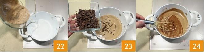 Faites chauffer la préparation obtenue 22 avec le chocolat noir haché que vous avez mis de côté 23 et mélangez avec les fouets à feu doux 24 pendant quelques instants.