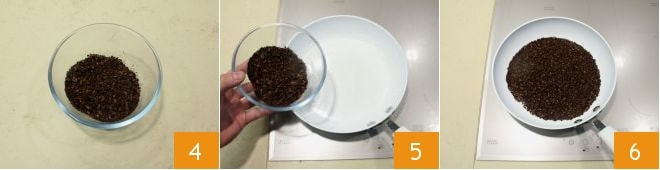 une fois cette étape terminée 4, mettez les grains dans une grande poêle antiadhésive 5, en les répartissant de manière uniforme et faites-les chauffer en mélangeant pendant quelques instants 6.