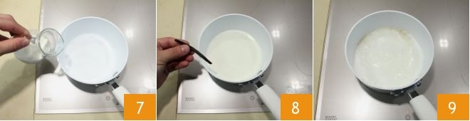 Dans une petite casserole à part, faites chauffer le lait 7 avec la gousse de vanille 8. Lorsque le lait atteint l'ébullition 9, retirez-le du feu