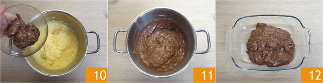 Retirez la casserole du feu et incorporez immédiatement la Nutella 10, tant que la crème est encore chaude. Mélangez vigoureusement pour l'incorporer complètement 11. Versez la crème prête dans un plat bas et large 12 et couvrez de film alimentaire au contact. Laissez refroidir complètement la crème à température ambiante avant de l'utiliser : il vous suffira de retirer le film et de la revigorer en mélangeant vigoureusement avec le fouet pendant quelques minutes. La crème à la Nutella est prête à être utilisée dans vos préparations.