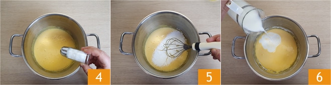 Ajoutez une pincée de sel 4, incorporez aussi la fécule de maïs tamisée 5, en l'alternant avec un verre environ de lait chaud, prélevé de celui mis sur le feu 6. Mélangez avec le fouet pour obtenir une consistance lisse et homogène.