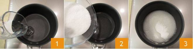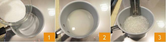 Pour réaliser la crème au beurre meringuée à utiliser pour les décorations de gâteaux (cupcakes et petites douceurs sur lesquelles vous souhaitez souligner des décorations particulières), commencez par faire un sirop : versez dans une casserole l'eau 1 et le sucre 2 et chauffez le mélange 3 jusqu'à ce qu'il ait atteint 121°C.