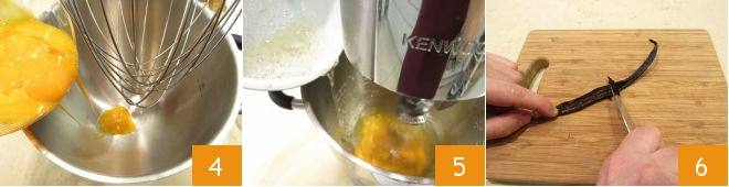 Lorsque le sirop est presque à température, mettez les jaunes d'œufs dans un batteur sur socle et commencez à les battre 4, ajoutez-y le sirop en filet 5, qui aura entre-temps atteint la température, et faites monter jusqu'à refroidissement complet. Pendant ce temps, incisez la gousse de vanille et prélevez-en les graines 6.