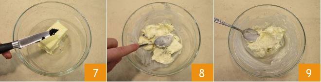 À ce stade, mettez le beurre dans un bol, ajoutez les graines de la gousse de vanille 7 et, à l'aide d'une cuillère, commencez à le travailler 8, jusqu'à obtenir un mélange homogène 9.