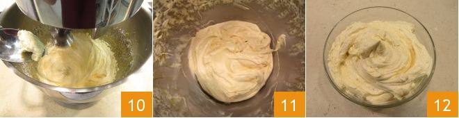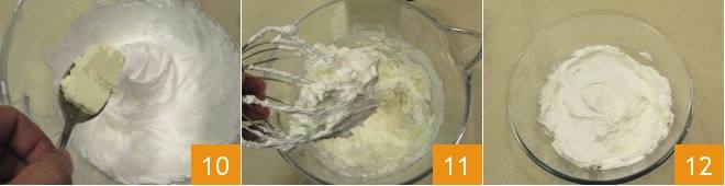 Lorsque le mélange (la meringue) est bien froid, ajoutez également le beurre, petit à petit 10 et incorporez-le en travaillant toujours avec les fouets 11. Une fois incorporé, votre crème au beurre meringuée est prête à être utilisée 12. Si vous le souhaitez, vous pouvez la colorer en ajoutant à cette étape du colorant, autant que nécessaire pour obtenir la teinte désirée. Continuez à mélanger jusqu'à obtenir une couleur uniforme. Mettez la crème au beurre dans une poche à douille et utilisez-la pour décorer la surface de petites tartes et cupcakes !