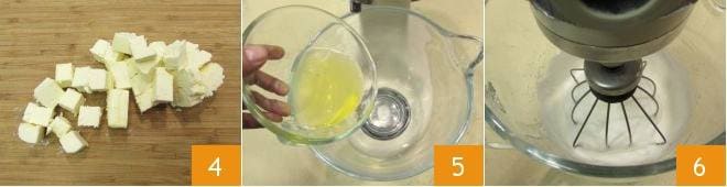 Entre-temps, coupez le beurre en morceaux 4; puis versez les blancs d'œufs dans le bol d'un batteur sur socle muni d'un fouet 5 et commencez à battre 6.