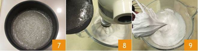 Lorsque le sirop atteint 121°C, versez-le en filet sur les blancs d'œufs qui montent dans le batteur sur socle 8. Continuez à battre jusqu'à refroidissement complet 9. Dès que le mélange est prêt, vous remarquerez le bec d'oiseau, c'est-à-dire une pointe sur la partie finale des fouets. Vous venez d'obtenir une meringue à l'italienne, laissez le mélange refroidir à température ambiante pendant au moins 15 minutes.
