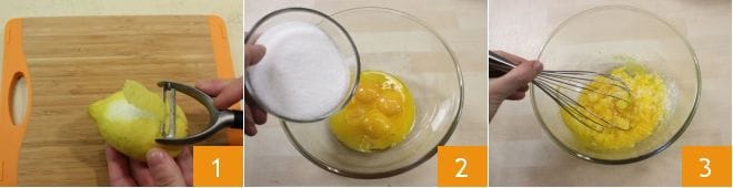 Pour préparer la crème au citron, prélevez le zeste des citrons en veillant à ne pas prendre la partie blanche 1 (vous pouvez mettre de côté un demi-citron pour en râper un peu une fois la crème cuite) et versez le zeste dans une casserole où vous avez ajouté le lait. Allumez le feu doux et faites tiédir le lait (il ne doit pas atteindre l'ébullition). Pendant ce temps, dans un bol, mettez les jaunes d'œufs, le sucre 2 et travaillez le mélange avec un fouet 3.