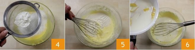 Vous devez obtenir une crème homogène, avant d'ajouter la farine et la fécule tamisées 4; mélangez avec le fouet pour incorporer les poudres 5, puis ajoutez le lait tiédi 6.