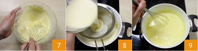 Mélangez énergiquement pour obtenir un mélange homogène et fluide 7, puis versez-le à nouveau dans la casserole en le filtrant avec une passoire à mailles fines pour éviter la formation de grumeaux 8. Allumez le feu doux et faites cuire la crème en mélangeant continuellement avec les fouets 9, jusqu'à ce qu'elle épaississe (cela prendra environ 15 minutes).