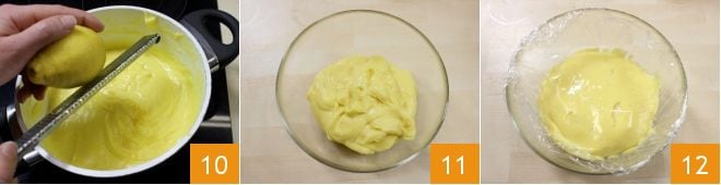 Quand elle a épaissi, avant d'éteindre le feu, vous pouvez râper le zeste d'un citron si vous le souhaitez pour aromatiser davantage 10; puis éteignez le feu et transférez la crème dans un bol 11, puis couvrez-la avec du film alimentaire au contact 12 et laissez-la refroidir avant de la placer au réfrigérateur pour l'utiliser !
