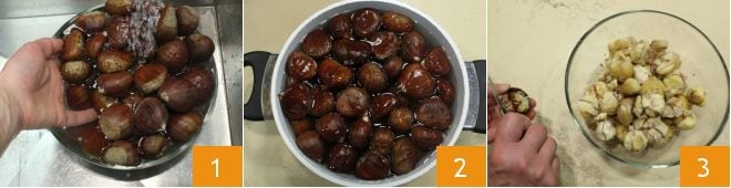 Pour préparer la crème de marrons, commencez par laver les marrons sous l'eau courante 1, puis placez-les entiers dans une casserole remplie d'eau et faites-les bouillir pendant au moins 15 minutes 2. Ensuite, égouttez-les et laissez-les tiédir. À ce stade, épluchez les marrons avec un petit couteau bien aiguisé 3.
