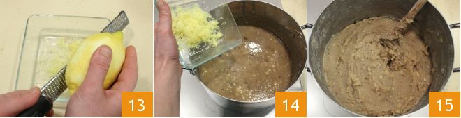 Râpez le zeste d'un citron non traité 13 et ajoutez-le à la crème 14. Faites cuire à feu doux pendant environ 1 heure, en remuant de temps en temps avec une cuillère en bois. La crème de marrons sera prête lorsqu'elle deviendra une purée crémeuse 15.