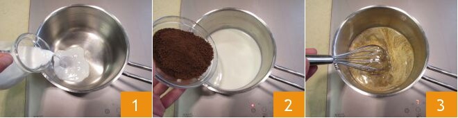 Pour préparer la crème diplomate au café, commencez par verser 200 g de lait dans une petite casserole 1 et portez-le à ébullition. Les autres 40 g seront utilisés plus tard. À ce stade, ajoutez le café soluble 2 et mélangez hors du feu jusqu'à ce qu'il soit complètement dissous 3.