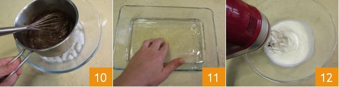 Pour arrêter la cuisson, plongez la casserole dans un bol avec de l'eau et de la glace 10. Remuez rapidement la crème jusqu'à ce qu'elle ne soit plus brûlante, elle devra être autour de 50°. Mettez de côté un moment et plongez la gélatine dans l'eau froide 11. Versez la crème froide dans un bol et avec un batteur électrique, montez-la 12,