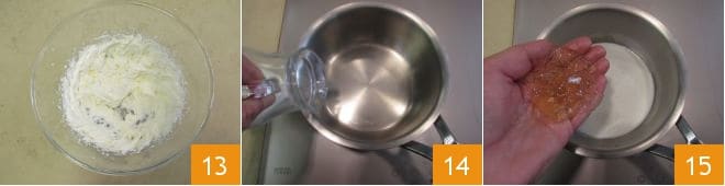 jusqu'à obtenir une consistance mousseuse 13. Versez les 40 g de lait restants dans une petite casserole 14, chauffez-le et dès qu'il frôle l'ébullition, éteignez le feu. Égouttez la gélatine, essorez-la délicatement et versez-la dans le lait 15.