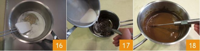 Mélangez jusqu'à ce qu'elle soit complètement dissoute 16, puis versez le tout dans la casserole avec la crème au café 17, en continuant à mélanger avec un fouet pour l'incorporer. Lorsque la crème aura atteint une température de 30°, vous pourrez incorporer la crème fouettée.