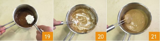 Ajoutez-en une cuillère à la fois 19 et mélangez délicatement 20 jusqu'à obtenir une consistance homogène 21.