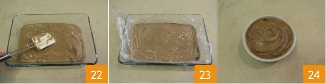 Transférez la crème diplomate au café dans un plat 22, couvrez avec un film plastique au contact 23 et laissez refroidir au réfrigérateur avant de l'utiliser 24.