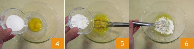 Dans un bol, versez les jaunes d'œufs, le sucre 4 et fouettez avec un fouet. Ajoutez la fécule de maïs 5 et mélangez à nouveau 6 jusqu'à obtenir un mélange sans grumeaux.