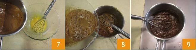 Ajoutez en filet le lait avec le café dans le bol avec le mélange de jaunes d'œufs 7, mélangez et versez à nouveau dans la casserole 8. Remettez sur le feu jusqu'à ce que la crème ait épaissi 9. Cela prendra quelques minutes.