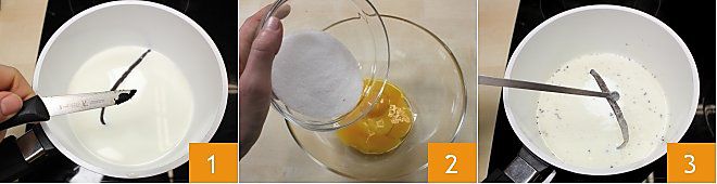 Pour préparer la crème diplomate sans gélatine, commencez par préparer la crème pâtissière : chauffez le lait dans une casserole avec la moitié d'une gousse de vanille et ses graines 1. Battez dans un bol, avec un fouet, le jaune d'œuf et le sucre 2, puis ajoutez la farine. Retirez la gousse avec une pince 3