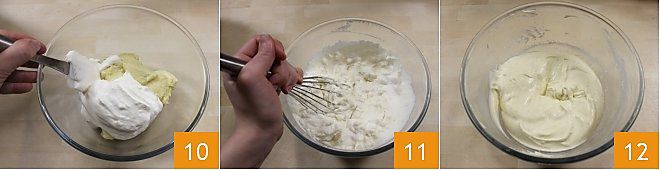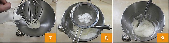 Préparez la crème chantilly : versez la crème bien froide dans le bol d'un batteur muni d'un fouet 7, ou utilisez un fouet électrique, et montez-la ; lorsque la crème aura atteint une consistance ferme, ajoutez le sucre glace tamisé 8, et incorporez-le à la crème, en mélangeant avec une spatule 9.