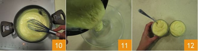 et continuez à mélanger jusqu'à ce qu'elle épaississe 10. Cela prendra quelques minutes. À ce stade, transférez dans un bol 11. Pour abaisser rapidement la température de la crème, placez le bol à l'intérieur d'un autre bol contenant de l'eau et de la glace, en remuant continuellement. Couvrez avec un film plastique et placez au réfrigérateur jusqu'au moment de servir la crème. Avant de la transférer dans des coupelles ou de l'utiliser, nous vous conseillons de la battre légèrement avec un fouet.