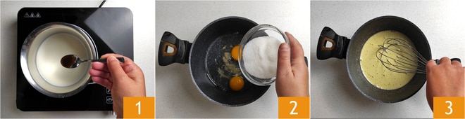 Pour préparer la crème pâtissière avec œufs entiers, commencez par verser le lait dans une casserole et ajoutez l'extrait de vanille 1. Faites chauffer le lait, à feu doux, jusqu'à frôler l'ébullition. Pendant ce temps, cassez les œufs dans une grande casserole, ajoutez le sucre 2 et mélangez avec un fouet jusqu'à ce que le mélange devienne clair 3.