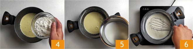 Ajoutez la fécule de maïs 4 et mélangez à nouveau pour obtenir un mélange crémeux et sans grumeaux. À ce stade, hors du feu, incorporez un peu de lait 5 à la fois, en mélangeant continuellement pendant le processus. Une fois tout le lait ajouté, placez la casserole sur feu doux et, en continuant de mélanger 6, cuisez encore pendant 5 minutes.