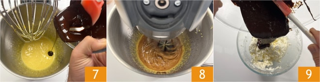 À ce stade, ajoutez le chocolat tiède dans le batteur sur socle 7 et travaillez pendant 3 minutes supplémentaires 8. Mettez le mascarpone dans un bol et ramollissez-le avec un fouet, puis ajoutez le mélange au chocolat 9.