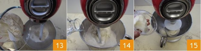 Ajoutez également la biga 13 et commencez à pétrir avec la feuille tout en versant l'eau à température ambiante en filet 14. Laissez tourner jusqu'à ce que vous obteniez une pâte homogène. Ensuite, remplacez la feuille par le crochet et continuez à pétrir pendant encore 5 minutes. Puis divisez le saindoux à température ambiante en deux parties : ajoutez-en une partie 15 et lorsqu'elle sera complètement incorporée à la pâte, ajoutez la seconde. Laissez tourner le pétrin pendant encore 7-8 minutes.