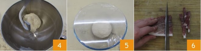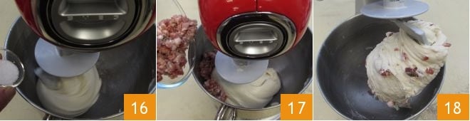 À ce stade, versez le sel 16 et pétrissez pendant 1 minute jusqu'à ce qu'il soit complètement absorbé par la pâte. Ajoutez également le jambon et la poitrine 17 et continuez à pétrir pendant encore 2-3 minutes : la pâte doit finalement être accrochée au crochet 18. Laissez-la reposer dans le pétrin couvert de film alimentaire transparent pendant environ 15 minutes. Après ce temps, donnez à la pâte 3 plis de renforcement et laissez reposer pendant encore 15 minutes. Répétez l'opération deux autres fois à chaque intervalle de 15 minutes.