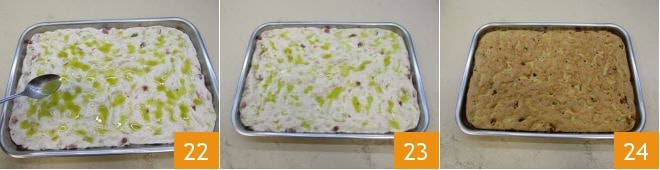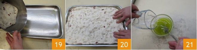 Enfin, huilez un plateau de 42x30 cm et déposez-y la pâte 19 : étalez-la avec les mains en exerçant une légère pression avec les doigts sur sa surface de manière à ce qu'elle soit uniformément répartie dans le plateau 20. Ensuite, mélangez l'huile avec l'eau et créez une émulsion en agitant les deux liquides avec une fourchette 21.