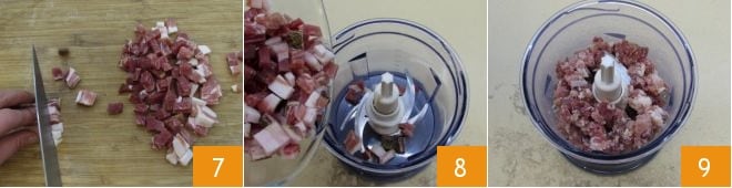 Obtenez également des cubes de la poitrine fumée 7. Versez le jambon et la poitrine dans un mixeur et mixez 8 : le hachis de cubes doit être plus fin 9 mais pas complètement en purée. Mettez de côté temporairement.