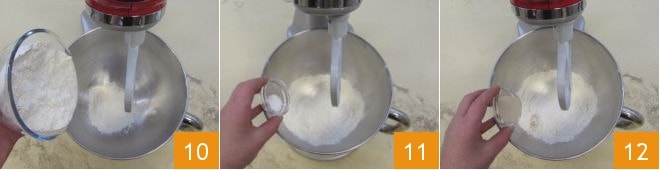 Procédez maintenant avec la pâte : dans un pétrin, versez la farine tamisée 10, le sucre 11 et la levure déshydratée 12.