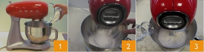 Pour préparer la croûte bolognaise, commencez par la préparation de la biga : dans un pétrin équipé d'un crochet, versez la farine tamisée 1 et la levure déshydratée 2. Pendant que vous commencez à pétrir à vitesse moyenne, versez l'eau à température ambiante en filet 3.