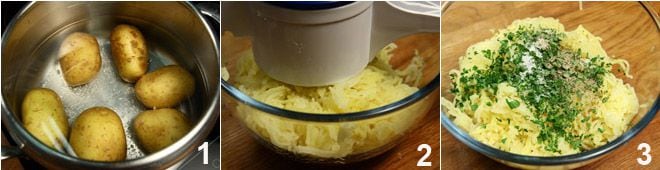 Dans une casserole, faites bouillir de l'eau salée, puis faites cuire les pommes de terre avec la peau 1, une fois cuites, épluchez-les et écrasez-les avec un presse-purée dans un bol 2. Ajoutez ensuite à la purée de pommes de terre, le persil, le sel et le poivre.
