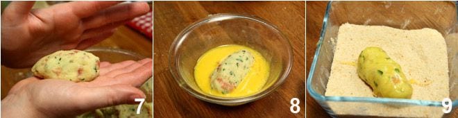 et prélevez avec les mains une partie du mélange (environ 50 g) et façonnez-le pour former des croquettes 7. Ensuite, passez les croquettes dans l'œuf battu 8, puis dans la chapelure 9