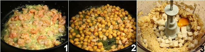 Dans une casserole, mettez l'huile, le beurre, l'ail et l'échalote hachés ; faites revenir le tout à feu doux pendant 10-15 minutes, puis ajoutez les crevettes 1 et laissez-les cuire pendant 5 minutes, ajoutez ensuite les pois chiches, les feuilles de thym, le sel et le poivre 2. Lorsque tout est bien parfumé et que le fond de cuisson est asséché, éteignez le feu et laissez tiédir. Versez tous les ingrédients dans un mixeur et mixez, puis ajoutez l'œuf et le pain de mie coupé en cubes 3,