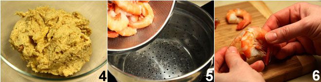 puis mixez à nouveau jusqu'à obtenir une pâte lisse et homogène 4. Pendant ce temps, faites bouillir les crevettes 5 et décortiquez-les en ne laissant que la partie finale de la queue 6.