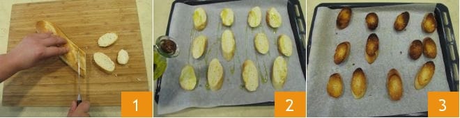 Pour préparer les crostini avec pâté de champignons de Paris, commencez par la préparation de la bruschetta. Prenez la baguette et coupez-la en tranches d'environ 2 cm d'épaisseur 1. Vous devriez obtenir environ 12 tranches. Disposez-les sur une plaque recouverte de papier sulfurisé et arrosez-les d'un filet d'huile 2. Faites cuire en mode grill à 240°C pendant environ 2-3 minutes jusqu'à ce qu'elles obtiennent une coloration dorée typique. Ensuite, sortez les bruschettas du four 3 et réservez-les.