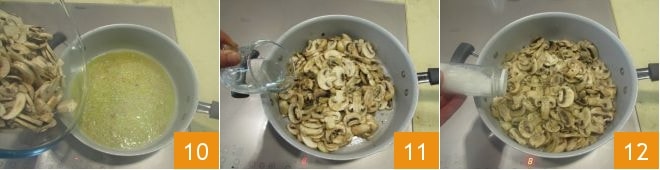 Ajoutez également les champignons 10, déglacez avec le vin blanc 11 et laissez évaporer. Ensuite, assaisonnez de sel 12 et de poivre.