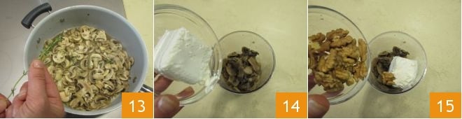 Enfin, ajoutez aussi les feuilles de thym 13. Laissez cuire environ 10-12 minutes à feu modéré. Ensuite, laissez refroidir légèrement et transférez les champignons cuits dans un récipient haut et étroit où vous ajouterez également la robiola 14 et les cerneaux de noix 15.