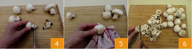 Passez au nettoyage des champignons, en éliminant la partie terreuse du pied du champignon : grattez bien avec un petit couteau pour éliminer toute trace de terre. Ensuite, retirez la partie terminale du pied 4. Si les champignons ne présentent pas beaucoup de terre, vous pouvez également vous aider avec un pinceau pour l'éliminer. Alternativement, passez-les rapidement pendant quelques secondes sous un filet d'eau froide courante et séchez-les immédiatement avec un chiffon en coton en le passant sur toute la surface du champignon afin qu'ils n'absorbent pas l'eau 5. Une fois nettoyés, coupez les champignons en tranches fines dans le sens de la longueur 6 et réservez-les.