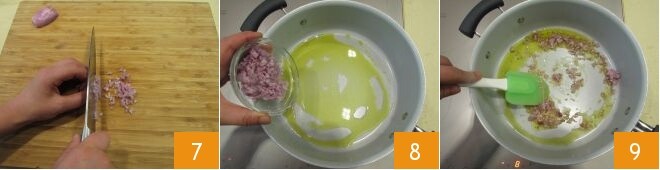Émincez finement l'échalote 7, mettez-la dans une grande casserole antiadhésive arrosée d'un filet d'huile 8. Faites-la revenir à feu doux pendant 5-6 minutes, en remuant pour favoriser une cuisson uniforme 9.