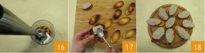 Mixez les ingrédients avec un mixeur plongeant 16 jusqu'à obtenir une crème homogène et suffisamment compacte. Ensuite, prenez les bruschettas et étalez dessus le pâté de champignons 17, puis servez vos crostini avec pâté de champignons de Paris 18 !