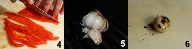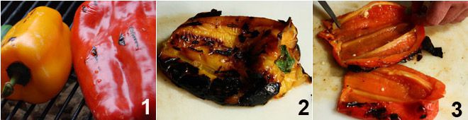 Tout d'abord, faites rôtir les poivrons sur le gril, directement au-dessus des braises 1 jusqu'à ce que la peau brûle 2, ils doivent avoir une consistance tendre mais encore croquante. Placez-les dans un récipient, couvrez de film plastique et laissez suer. Ce procédé facilitera l'élimination de la peau des poivrons. Ensuite, pelez-les et retirez les graines et les filaments internes 3.